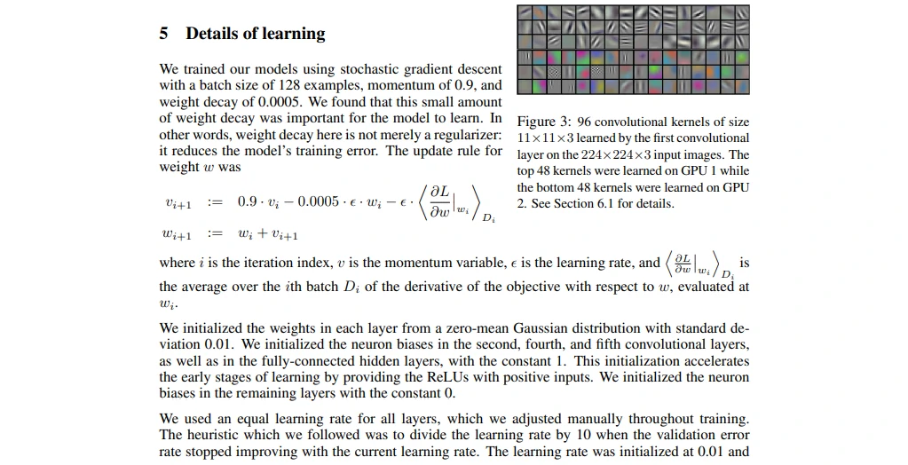 batch size是128,momentum是0.9,weight decay是0.0005。weight decay当时在机器学习界主流上应该叫作L2 regularization(L2正则项),但是这篇文章以及神经网络里面喜欢叫作weight decay,所以这个东西不是加在模型上,而是加在优化算法上,虽然说这两者其实是等价的关系,但深度学习的崛起大家也都叫做weight decay了。momentum也是防止在一段非极值较陡的区域上陷入局部最低点,而是保有一个冲量,冲过这一段,更好地找到最值。