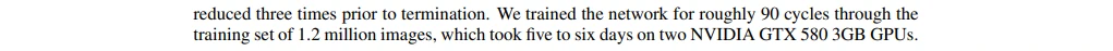 我们对所有的层使用相等的学习率,这个是在整个训练过程中我们手动调整得到的。当验证误差在当前的学习率下停止改善时,我们遵循启发式的方法将学习率除以10。学习率初始化为0.01,在训练停止之前降低三次。我们在120万图像的训练数据集上训练神经网络大约90个循环,在两个NVIDIA GTX 580 3GB GPU上花费了五到六天。