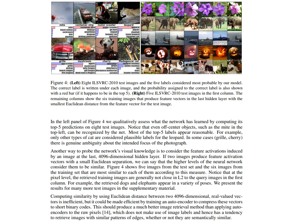 右边的图比较有意思,他是把神经网络倒数第二层的图片拿出来,得到一个长的向量,根据余弦相似度得到相近的图片组,发现都很像。虽然论文没有讨论到这个东西有多重要,但实际上可能这才是最重要的结果。就是说深度神经网络最后训练出来的向量在语义空间里的表示特别好,相似的图片会把它放在一起,是一个非常好的特征,非常适合用之后机器学习的简单的分类器来分类,这也是深度学习的一大强项。