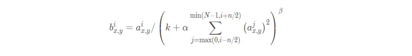 大致意思就是当今kernel的map的(x, y)像素位置在周围邻居相同kernel的map的(x, y)像素。然后把这些邻居pixel的值平方再加和。乘以一个系数 α 再加上一个常数k, 然后 β 次幂就是分母,分子就是kernel对应的map的(x, y)位置的pixel值。关键是参数 α, β, k如何确定, 论文中说在验证集中确定, 最终确定的结果为: k = 2, n = 5, α = 0.0001, β = 0.75