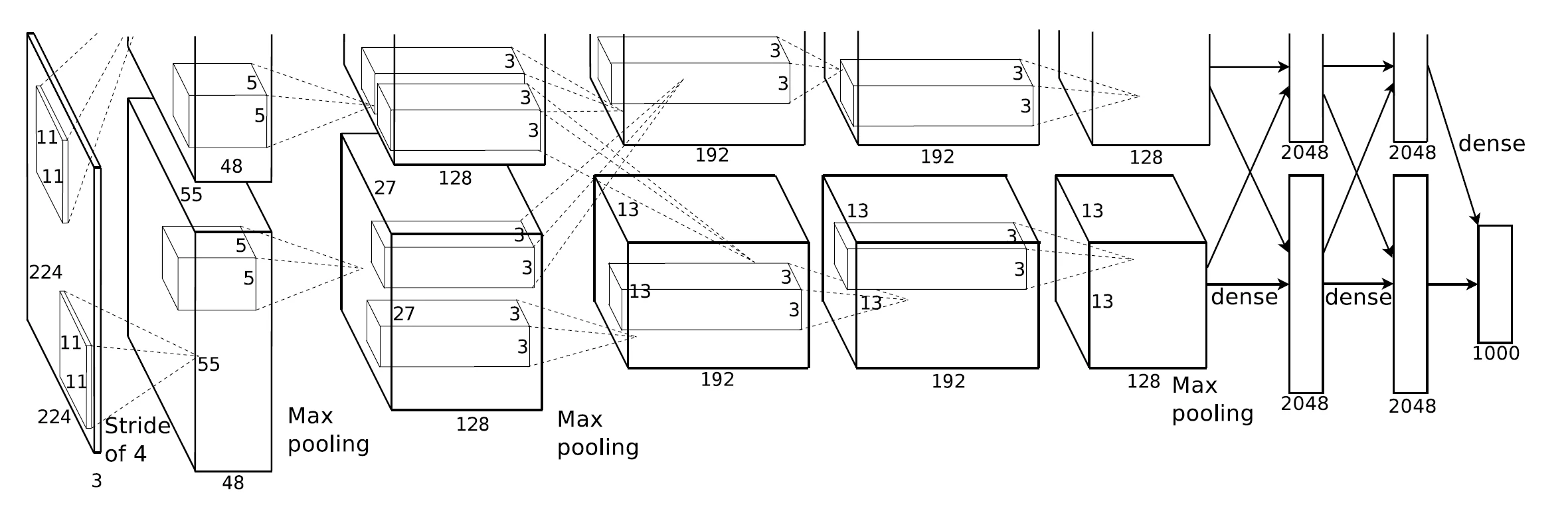 - 最大池化层在响应规范化层(第1层和第2层卷积)和第5层卷积后。