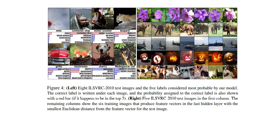 图4:(左)8张ILSVRC-2010测试图像和我们的模型认为最可能的5个标签。每张图像的下面是它的正确标签,正确标签的概率用红色柱形表示(如果正确标签在top 5中)。(右)第一列是5张ILSVRC-2010测试图像。剩下的列展示了6张训练图像,这些图像在最后的隐藏层的特征向量与测试图像的特征向量有最小的欧氏距离。