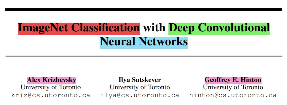 下面是论文的作者,论文一作是Alex,这也是本篇论文提出的网络被称为AlexNet的原因。可能对论文前两个作者不是很熟悉,但是论文通信作者是Hinton,长期研究神经网络和深度学习。