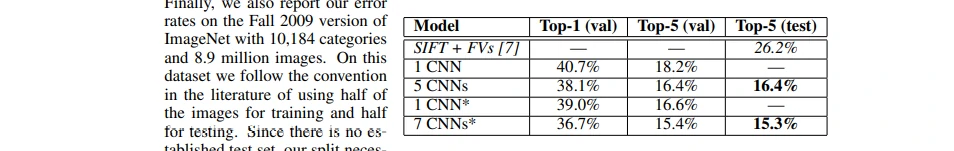 表2:ILSVRC-2012验证集和测试集的误差对比。斜线部分是其它人取得的最好的结果。带星号的是“预训练的”对ImageNet 2011秋季数据集进行分类的模型。更多细节请看第六节。