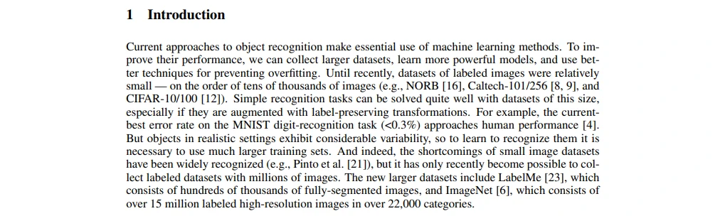 大数据集、大模型、更好的技术来防止过拟合,这基本是机器学习正常的途径。当时深度学习界认为,大模型+正则来防止过拟合,并且在之后几年内大家也是这么做的。但现在观点来看,好像正则又不是很重要,关键是整个神经网络的设计,使得很大的神经网络在没有很好的正则情况下也能训练的很好。这部分的理论和实践工作还在推进,坐等以后新的结论。后面吹了一下它这个ImageNet特别好,毕竟题目就说了本文用的是ImageNet,吹一下它数据量大、类别多。