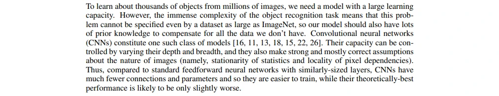为了从数百万张图像中学习几千个对象,我们需要一个有很强学习能力的模型。然而对象识别任务的巨大复杂性意味着这个问题不能被特定化,即使通过像ImageNet这样足够大的数据集,因此我们的模型应该也有许多先验知识来补偿我们所没有的数据。卷积神经网络(CNNs)构成了一类这样的模型[16, 11, 13, 18, 15, 22, 26]。它们的容量可以通过改变它们的深度和广度来控制,它们也可以对图像的本质进行强大且通常正确的假设(也就是说,统计的稳定性和像素依赖的局部性)。因此,与具有层次大小相似的标准前馈神经网络相比,CNNs有更少的连接和参数,因此它们更容易训练,而它们理论上的最佳性能可能仅比标准前馈神经网络稍微差一点。