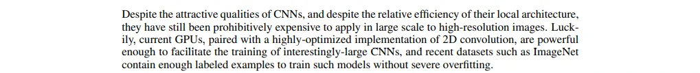 尽管CNN具有引人注目的质量,尽管它们的局部架构相对有效,但是将它们应用到大规模的高分辨率图像中仍然是极其昂贵的。幸运的是,目前的GPU,搭配了高度优化的2D卷积实现,强大到足够促进有趣大量CNN的训练,以及最近的数据集例如ImageNet包含足够多的标注样本来训练这样的模型而没有严重的过拟合。