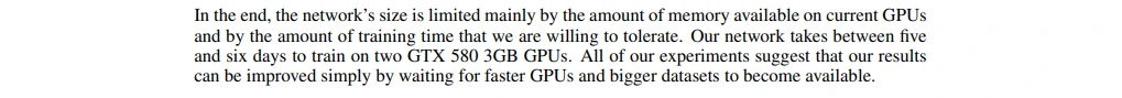 最后,网络尺寸主要受限于目前GPU的内存容量和我们能忍受的训练时间。我们的网络在两个GTX 580 3GB GPU上训练五六天。我们的所有实验表明我们的结果可以简单地通过等待更快的GPU和更大的可用数据集来提高。