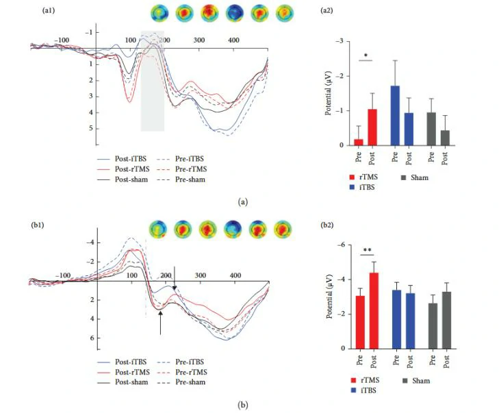 本研究的结果有力地支持了奖赏回路靶向的rTMS和iTBS在改善抑郁症患者自杀意念和快感缺失方面的有效性。特别是rTMS,它不仅在临床症状上有所改善,还在神经生理层面调节了N170和FRN等关键ERP成分,这可能与奖赏加工能力的提升相关。尽管iTBS未在所有ERP指标上显示出显著改变,但其临床疗效与rTMS相当,提示可能存在不同的神经机制或更广泛的网络效应。