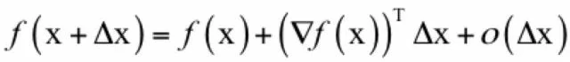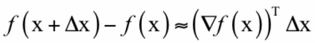 这里我们忽略了二次及更高的项。其中,一次项是梯度向量▽f(x)与自变量增量Δx的内积(▽f(x))T Δx,这等价于一元函数的f’(x_0)Δx。这样,函数的增量与自变量的增量Δx、函数梯度的关系可以表示为:
