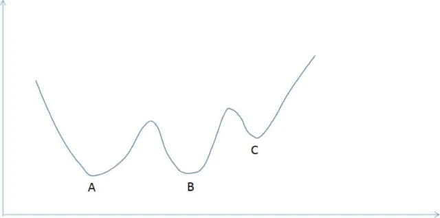 这张图中的函数有3个局部极值点,分别是A,B和C,但只有A才是全局极小值,梯度下降法可能迭代到B或者C点处就终止。