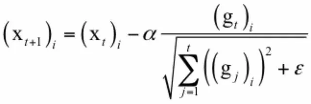 其中α是学习因子,g_t是第t次迭代时的参数梯度向量,ε是一个很小的正数,为了避免除0操作,下标i表示向量的分量。和标准梯度下降法唯一不同的是多了分母中的这一项,它累积了到本次迭代为止梯度的历史值信息用于生成梯度下降的系数值。