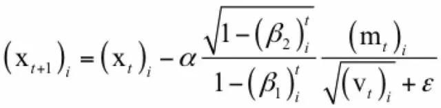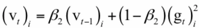 其中β1, β2是人工指定的参数,i为向量的分量下标。依靠这两个值构造参数的更新值,参数的更新公式为: