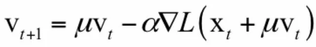 NAG算法是一种凸优化方法,由Nesterov提出。和标准梯度下降法的权重更新公式类似,NAG算法构造一个向量v,初始值为0。v的更新公式为: