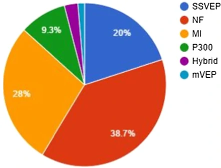 根据交互方式,可将目前已有的基于EEG的BCI游戏分为两大类:(1)仅通过EEG控制游戏。(2)BCI与外部设备集成在一起以实现游戏控制。其中仅通过EEG最为输入的BCI游戏,根据控制模态,又分为很多种。图1总结了目前这类BCI游戏常用的模式,以及各种模态的占比。
