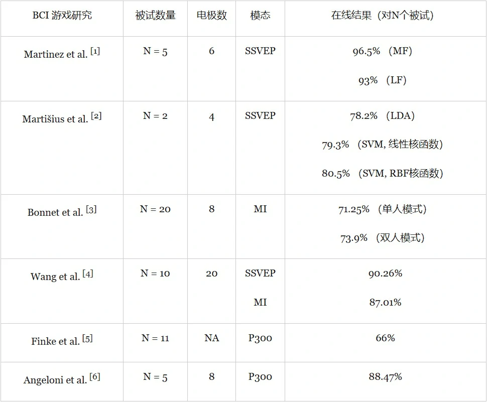 在表1中,总结了引用率比较高的BCI游戏相关研究。其中Martinez等提出了一种基于SSVEP的新BCI系统,该系统允许BCI用户在四个方向上的任意一个方向上实时浏览计算机屏幕上的小型汽车,并在必要时将其停止。最终,在低频(LF)范围(5、6、7、8 Hz)的平均在线精度达到93%,在中频(MF)范围(12、13.3、15, 17 Hz)的平均在线准确率达到96.5%[1]。Bonnet等人创建了一个名为BrainArena的多用户视频游戏,其中两个用户可以通过两个BCI玩简单的足球游戏。单人游戏模式下的平均分类准确度为71.25%,双人游戏模式下的平均分类准确度为73.9%[2]。Martišius等使用Emotiv EPOC耳机开发了基于SSVEP范例的在线射击游戏。该系统使用波原子变换进行特征提取,使用线性判别分析分类器可达到78.2%的平均准确度,使用具有线性核的SVM分类器可实现79.3%的平均准确度,使用带有径向基函数核的支SVM分类器则实现80.5%的平均准确度[3]。Wang等结合了MI和SSVEP,以生成多个命令来共同控制俄罗斯方块。MI和SSVEP的分类准确率分别达到了87.01%和90.26%[4]。Finke等 提出了基于P300的MindGame,在线运营过程中单项试验的分类率达到了66%[5]。Angeloni等提出了一种基于P300 BCI的记忆游戏,平均总体准确度为88.47%[6]。