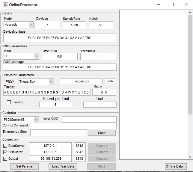 P300程序配合脑电信号采集系统使用,可以达到脑电数据的在线分析处理。同时程序拥有训练模式构造被试的训练模型,很大程度上排除了个体差异,具有针对性。且P300程序必须进行训练,加载训练数据。程序主要分为两部分,一个是刺激器,一个是处理器。包含两种模式:训练模式和实验模式。