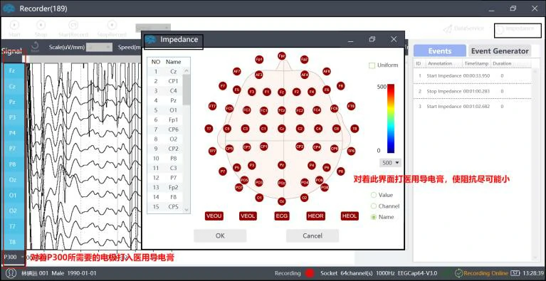 受试者佩戴好脑电帽,在相应的电极上(在界面左侧有标记出P300需要的电极)打入适量的医用导电膏(稍稍溢出即可),打开Impedance界面可以查看阻抗的大小,对着此界面调整导电膏的量,以减小阻抗。