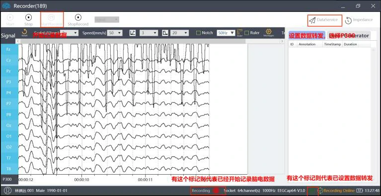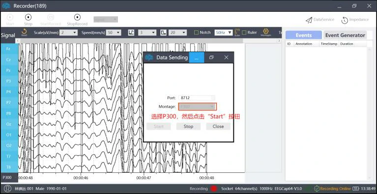 开启脑电采集软件的数据转发端口,选择转发P300的Montage,并记录数据;