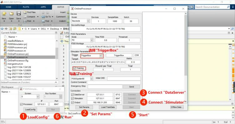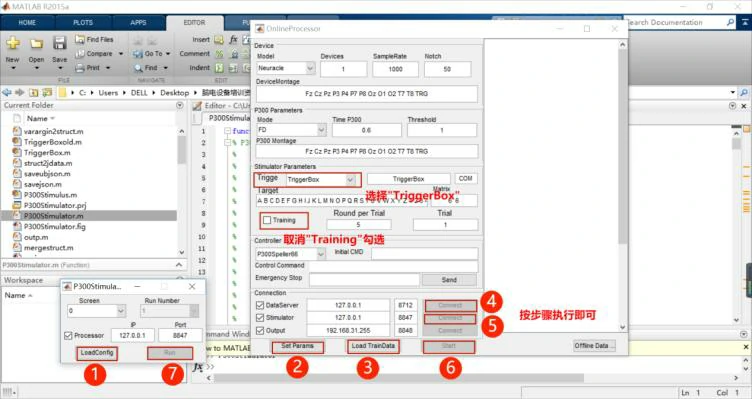 勾选训练模式Training,点击刺激器界面的加载配置按钮LoadConfig,在3s内快速点击处理器界面的设置参数按钮Set Params,出现一个提示框,点击OK即可;