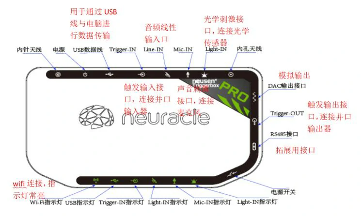 智能同步中心通过WI-FI将无线脑电放大器与电脑无线相连。首先连接智能同步中心的电源,待路由器的蓝灯亮起即代表路由器正常工作,之后再把Trigger Box分别连接电源和电脑,在电脑上连接名为NeusenW2-5G的WI-FI。