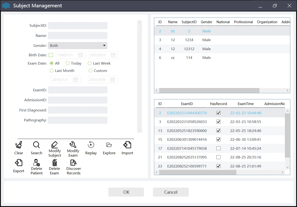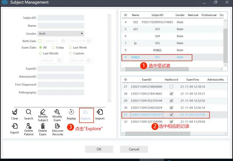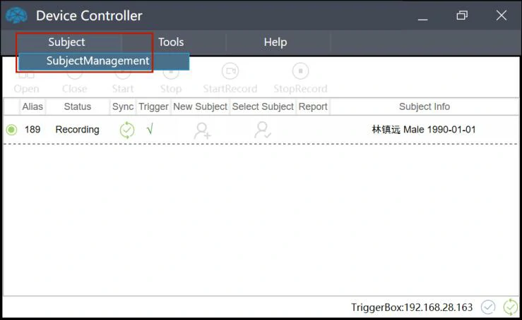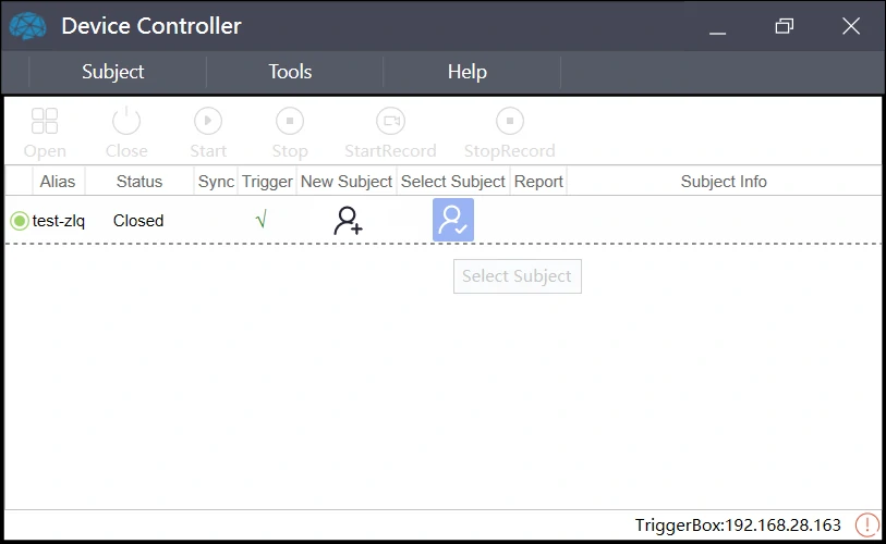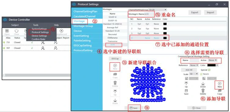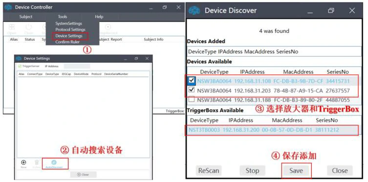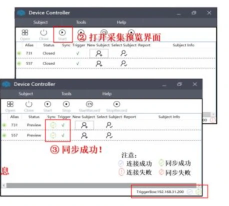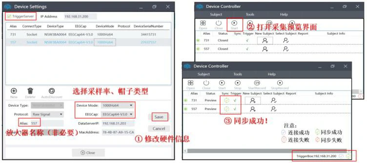 启动脑电信号采集软件,脑电帽和放大器吸合完好,多参同步盒连接正确,搜索设备并添加;
