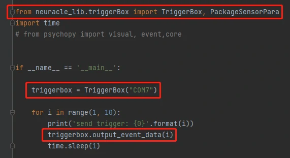 导入打标的py库,填写好打标的串口号,运行该行代码即可在采集脑电过程中插入打标信息(脑电信息与打标信息各自单独文件)