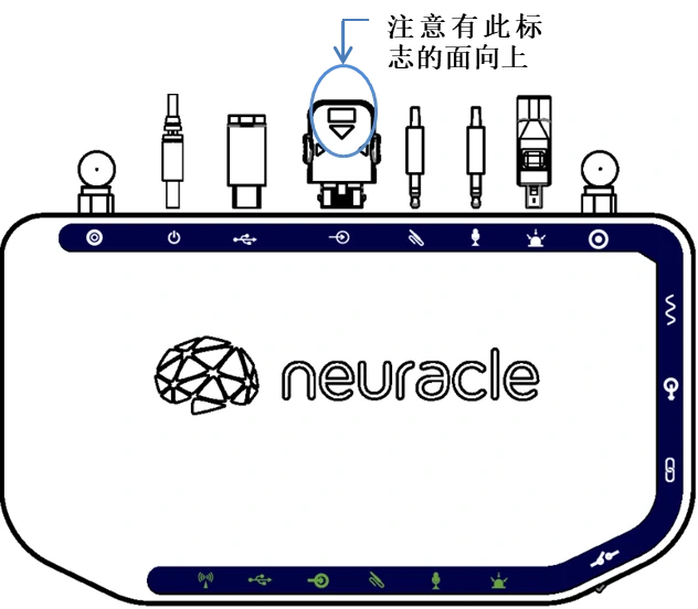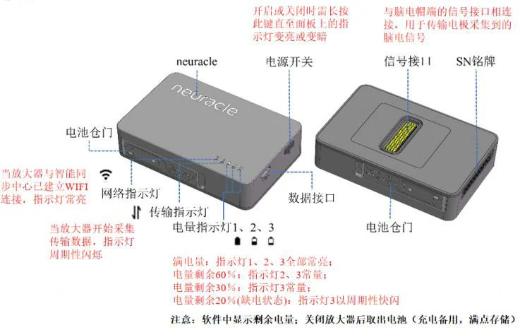 - 放大器装载电池,固定至脑电帽,长按至设备震动、电源指示灯亮起,静待网络指示灯亮起。