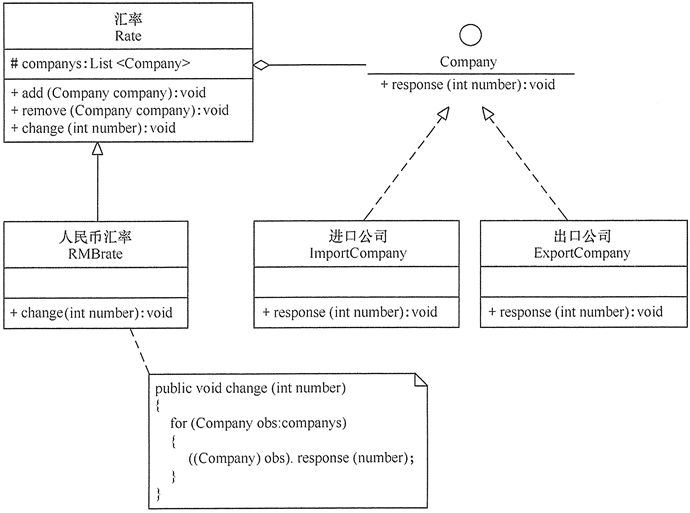 这里的汇率(Rate)类是抽象目标类,它包含了保存观察者(Company)的 List 和增加/删除观察者的方法,以及有关汇率改变的抽象方法 change(int number);而人民币汇率(RMBrate)类是具体目标, 它实现了父类的 change(int number) 方法,即当人民币汇率发生改变时通过相关公司;公司(Company)类是抽象观察者,它定义了一个有关汇率反应的抽象方法 response(int number);进口公司(ImportCompany)类和出口公司(ExportCompany)类是具体观察者类,它们实现了父类的 response(int number) 方法,即当它们接收到汇率发生改变的通知时作为相应的反应。