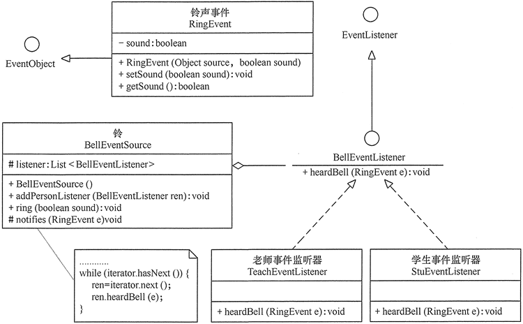 class BellEventSource { private List<BellEventListener> listener; public BellEventSource() { listener = new ArrayList<BellEventListener>(); } public void addPersonListener(BellEventListener ren) { listener.add(ren); } public void ring(boolean sound) { String type = sound ? "上课铃" : "下课铃"; System.out.println(type + "响!"); RingEvent event = new RingEvent(this, sound); notifies(event); } protected void notifies(RingEvent e) { BellEventListener ren = null; Iterator<BellEventListener> iterator = listener.iterator(); while (iterator.hasNext()) { ren = iterator.next(); ren.heardBell(e); } } }