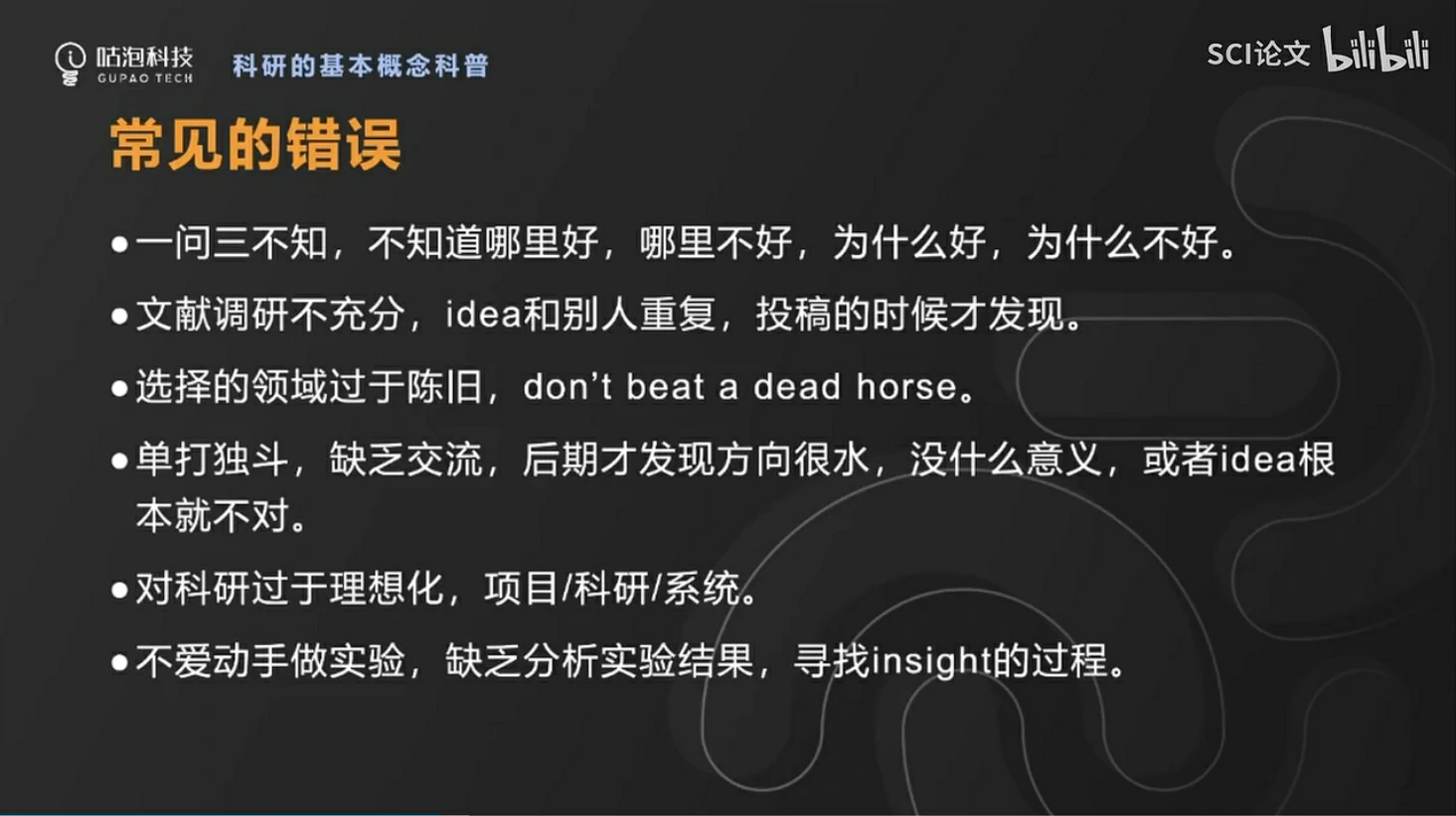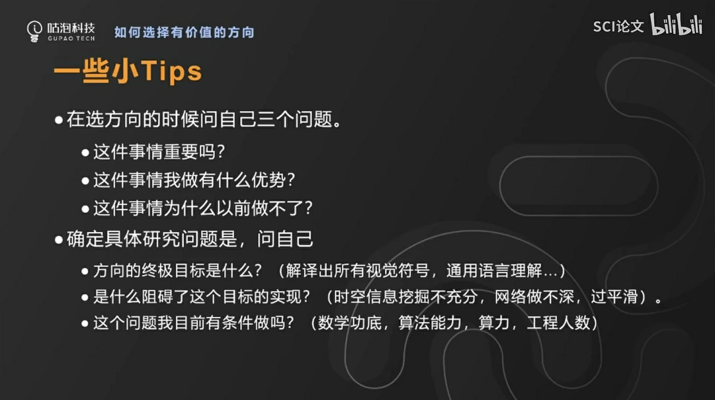 如何寻找顶会潜质的论文创新点,论文筛选、论文阅读、论文创新点 发表于 2023-08-02 分类于 🌙逢坂杂谈与搬运 , ⭐一些讲座 阅读次数: Valine: 本文字数: 199 阅读时长 ≈ 1 分钟视频总结如何寻找具有顶会潜质的创新点。作者分享了自己的科研经历和困惑强调正确的方法和科学思维方法对于做好科研至关重要。视频从科研的基本概念、如何选择有价值的方向阅读文献、设计实验迭代研究方案等方面进行了分享。最后作者引用 ICML Review guideline 列出了四个指标来定义好的科研工作。 参考资料https://www.bilibili.com/video/BV1SH4y197Zv/