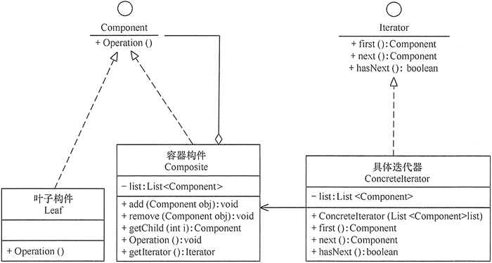 迭代器模式常常与组合模式结合起来使用,在对组合模式中的容器构件进行访问时,经常将迭代器潜藏在组合模式的容器构成类中。当然,也可以构造一个外部迭代器来对容器构件进行访问。