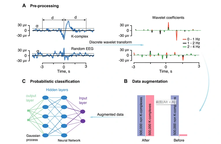 本篇学习报告的内容为:一种使用概率分类检测K复合波的深度学习方法,所参考的文献是《Beyond K-complex binary scoring during sleep: probabilistic classification using deep learning》。本文算法基于深度神经网络和高斯过程,使输入波形为K复合波的概率在0%到100%之间。概率分类方法对于系统化的K复合波检测来说适合且有效,有助于深入研究睡眠过程中K复合波与临床结果之间的潜在关系。