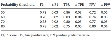 通过增加概率阈值提升PPV,然而TPR降低,F1不变。说明概率阈值的改变并不一定会提高算法的整体性能。