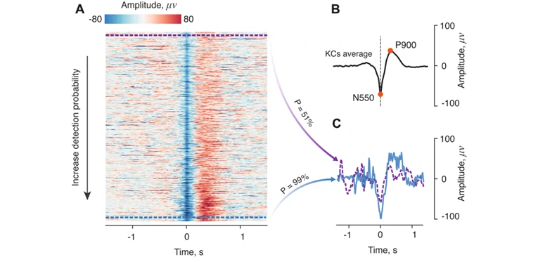 KCs从上到下按得分概率递增的顺序排列,其中红色表示80μV左右的正电压峰值(P900),蓝色表示-80μV左右的负电压峰值(N550)。x轴上的时间值与N550峰值对齐(t=0s)。