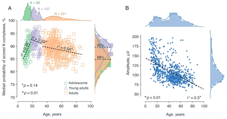 (1)KCs的大小随着年龄的增长而变化,在青春期达到最大值,然后随着年龄的增长而不断衰减。因此,本文使用CFS数据集(N=599)研究了KCs的中值得分概率随年龄变化的差异,期望年长的个体会表现出更小的中值KC概率和更小的KC峰间振幅。
