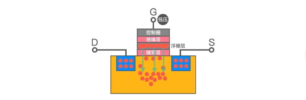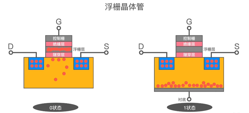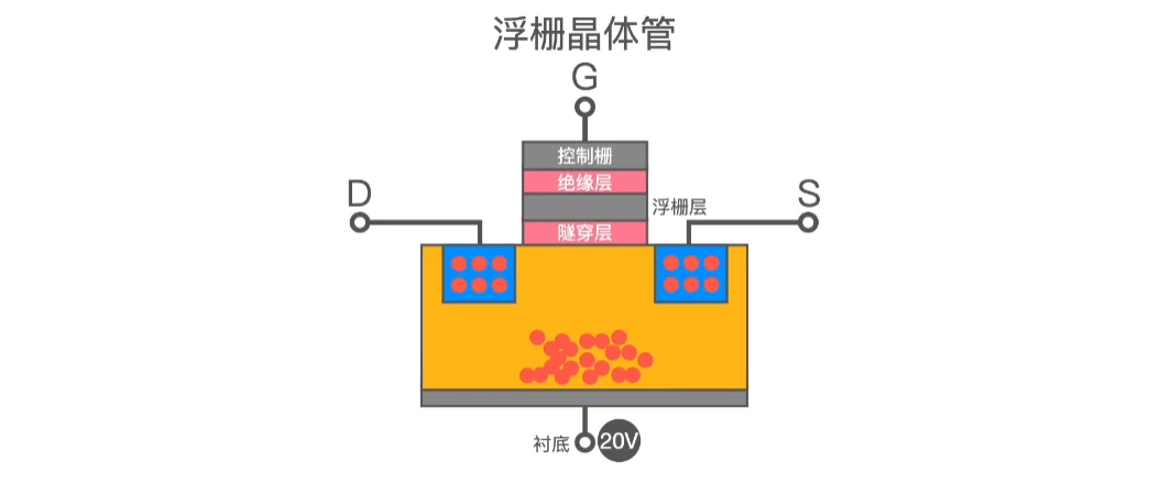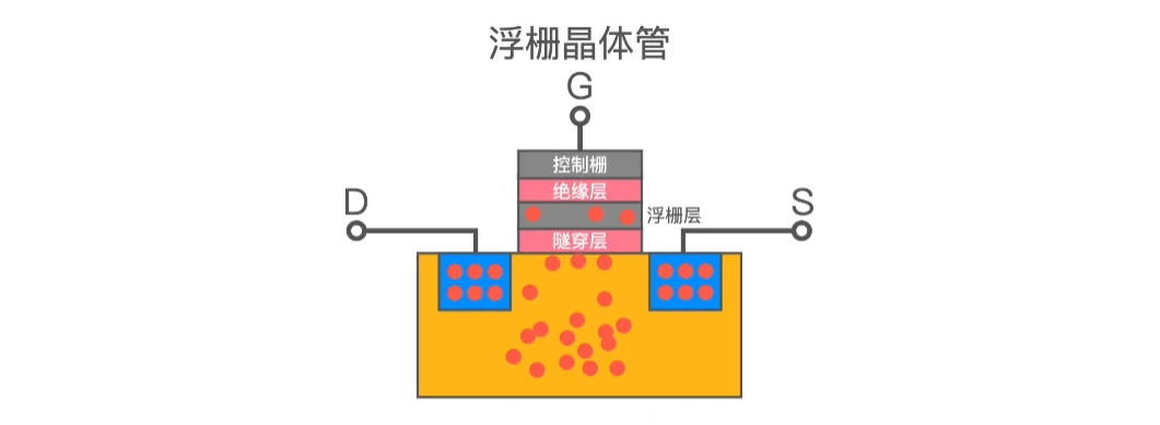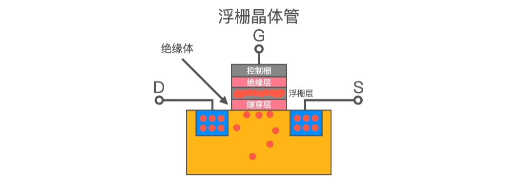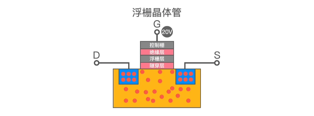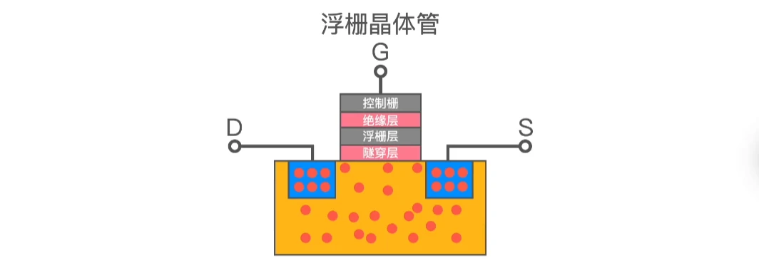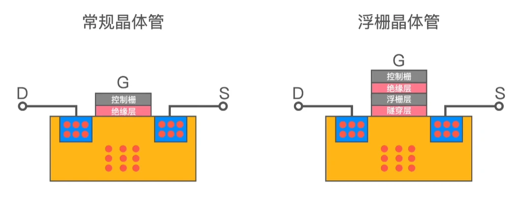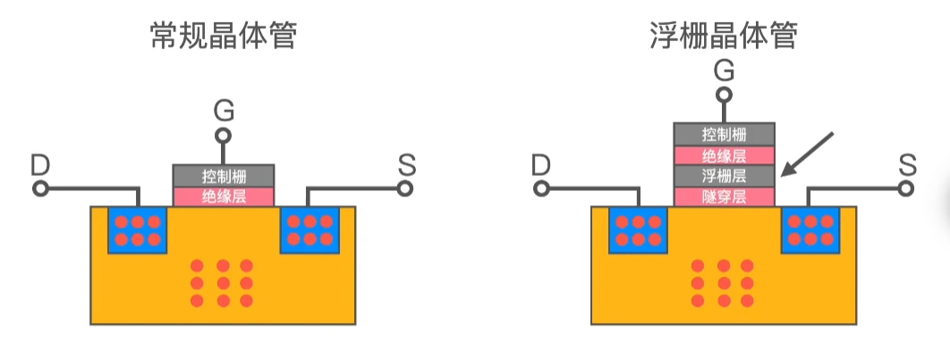这种常规的晶体管只能控制截止和导通,而浮栅晶体管在常规晶体管的基础上多了两层东西,其中一层是隧穿层,另外一层是浮栅层
