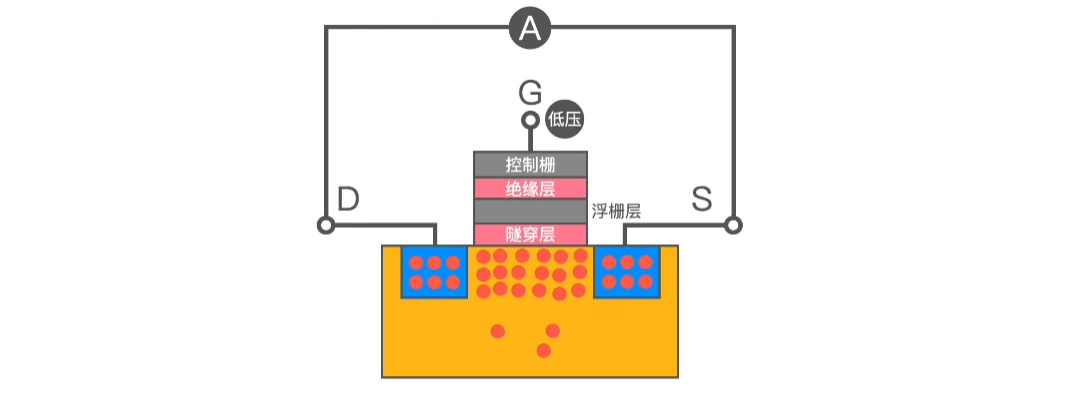 关于它读数据的原理也非常简单,比如当它没有存储电子的时候,我们给栅极一个低压,它就会导通,因为电压低,电子只能被吸引到这里,所以就导通了形成电流