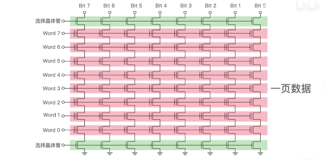再来说说它为什么以页为单位来读写,因为字线同时连接到了这一页上所有晶体管的栅极,它没法单独的去控制里面的每一个晶体管