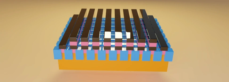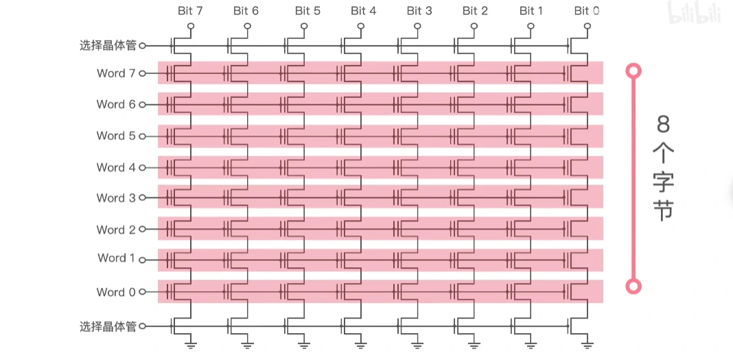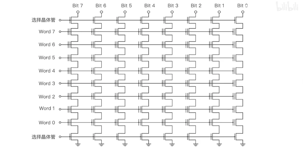 行代表字线,列代表位线,一行就是一个字节,这一块数据总共可以存储8个字节。它的每一列晶体管都是串联的,结构上是这样的:每两个晶体管共用一个N区,可以减少制造难度,它的这一列共用一个衬底