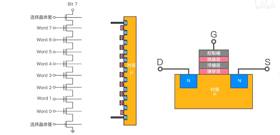 其实不止是每一列,它的这一块数据都共用一个衬底,所以只要我们给衬底施加高压,这一整块的数据都会消失。这就是它为什么是以块来擦除数据的原因。