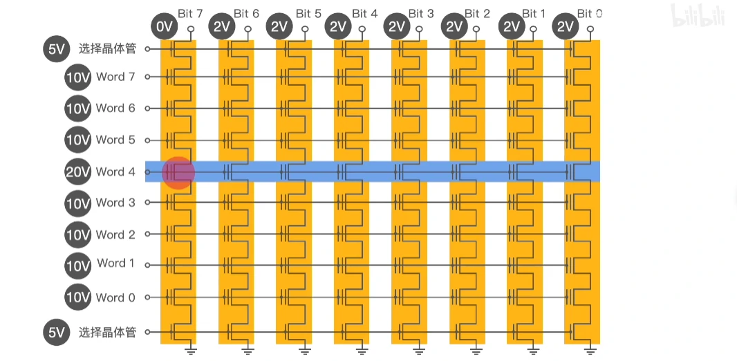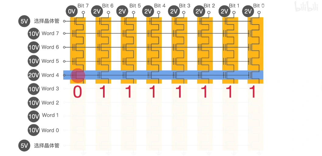 比如我们要给某个晶体管写入数据,就需要给这个字线高压,给它的位线写0,其它的如图。这样这一个晶体管在高压下就会存储电荷,而我们不想存储电荷的话,就给它的位线2V电压,这样由于这些晶体管的沟道效应就阻碍的电子进入晶体管的浮栅层,所以它们就没有存储电荷
