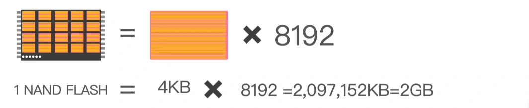 而一个NAND FLASH里面含有8,192个这样的数据块,总空间就是2,097,152KB,也就是2个G的存储空间