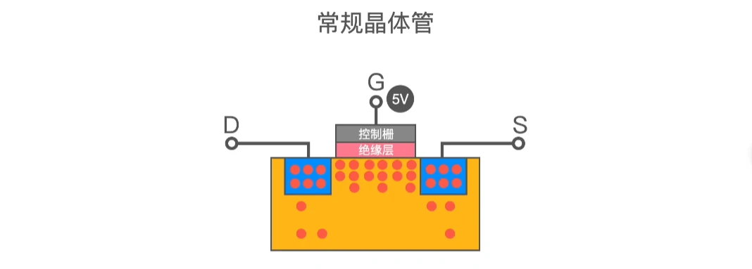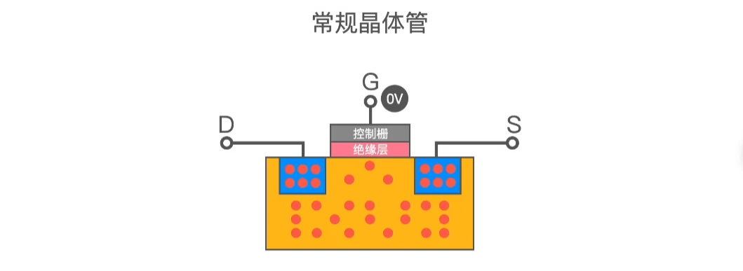 先说一下常规晶体管的工作原理,红色小球代表电子,当栅极电压为0时,它是截止的