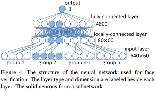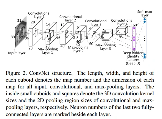 一共4个卷积层,其中前三个卷积层后都有一个max-pooling layer。注意最后一个卷积层相当小(1*2的feature map)。正因为太小,是信息传递的瓶颈,所以,第一个全连接层(DeepID层,160维)同时全连接到最后一个卷积层和第三个卷积层(池化后)。最后一个全连接层是学习类别分布的,若类别数是10000,则该层维度是10000。