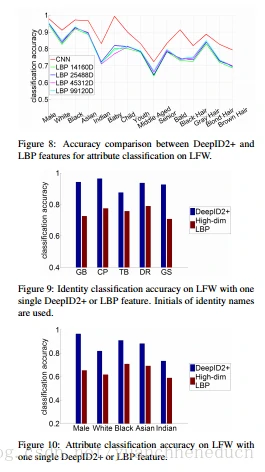 Fig.8:属性分类的精确性,和不同维度的LBP特征进行比较。这部分用的特征是单个DeepID2+net产生的fc4特征+水平翻转图像的特征。