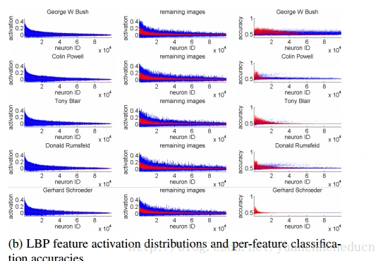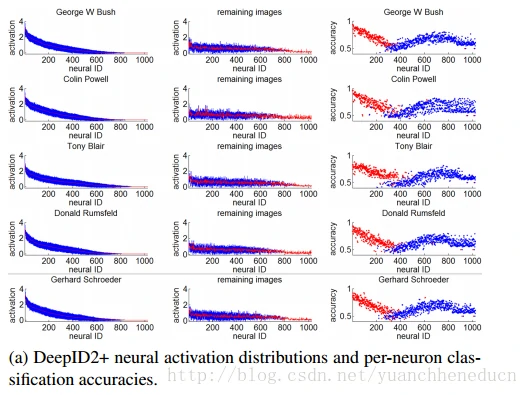 为了验证DeepID2+特征中每个神经元的判别能力,作者进行了两方面的实验:身份的二值分类(即是否属于某个人),属性的二值分类(是否拥有某个属性)。