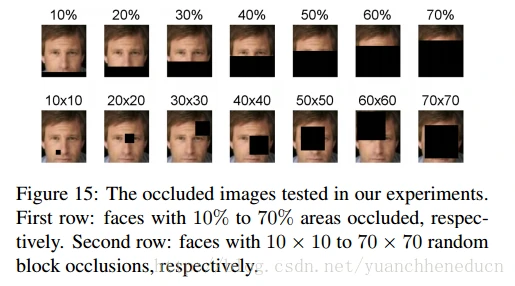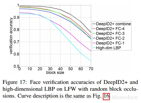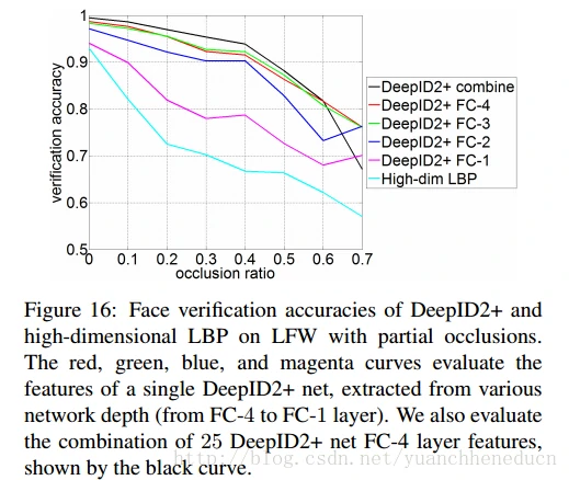 测试DeepID2+特征对遮挡的鲁棒性,发现:尽管特征是在没有人为遮挡的图像上训练的net上提取的,但是却自动地学习到了对遮挡鲁棒的特征。