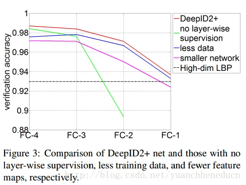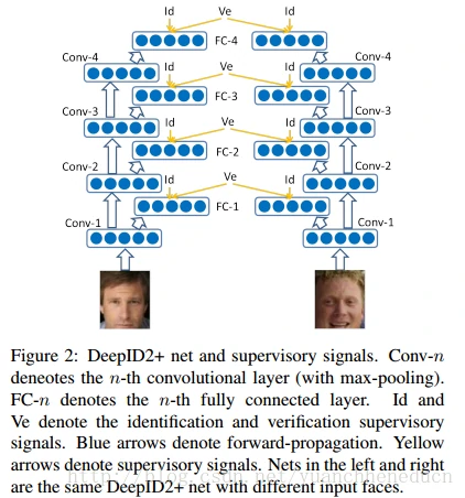 这个数据集有12,000个个体的大约290,000张图片。(原来的8,000个个体,160,000张图片) - 监督信号不仅在FC4上有,DeepID2+在早期的每个卷积层的后面都加了一个512为的全连接层,并添加identification-verification的监督信号。