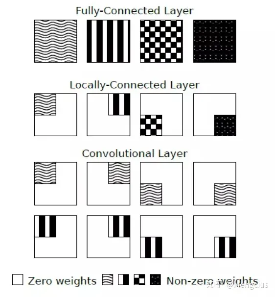 - 卷积层(Convolutional Layer,CNN):当数据集具有全局的局部特征分布时,也就是说局部特征之间有较强的相关性,适合用全卷积。每一个点都用同一个filter,权重共享。